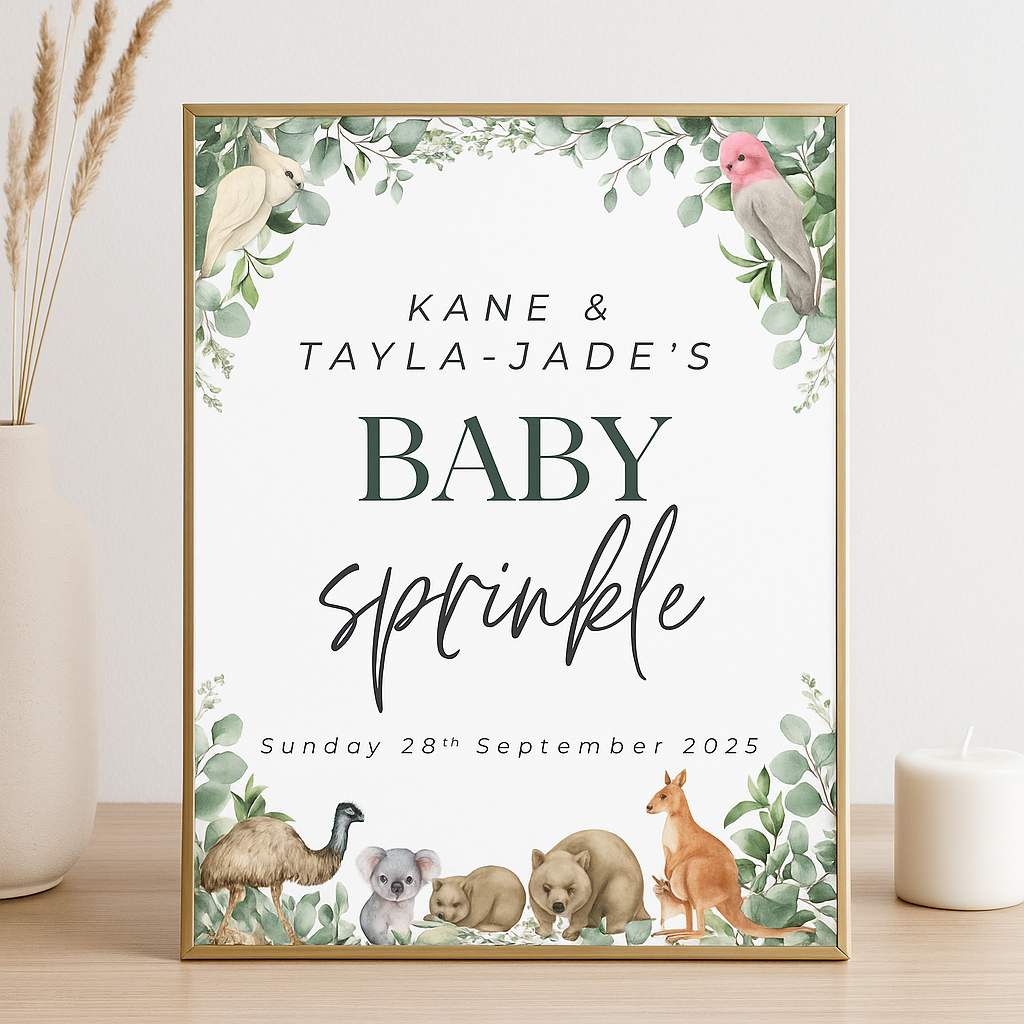 Welcome your guests in style with our "Australiana Welcome Sign", a beautifully designed piece that adds elegance and charm to any celebration. Featuring digitally illustrated eucalyptus greenery and iconic Australian wildlife (galah, cockatoo, kangaroo, wombat, koala, emu, platypus) this unique design creates a striking focal point and a warm first impression as guests arrive.
