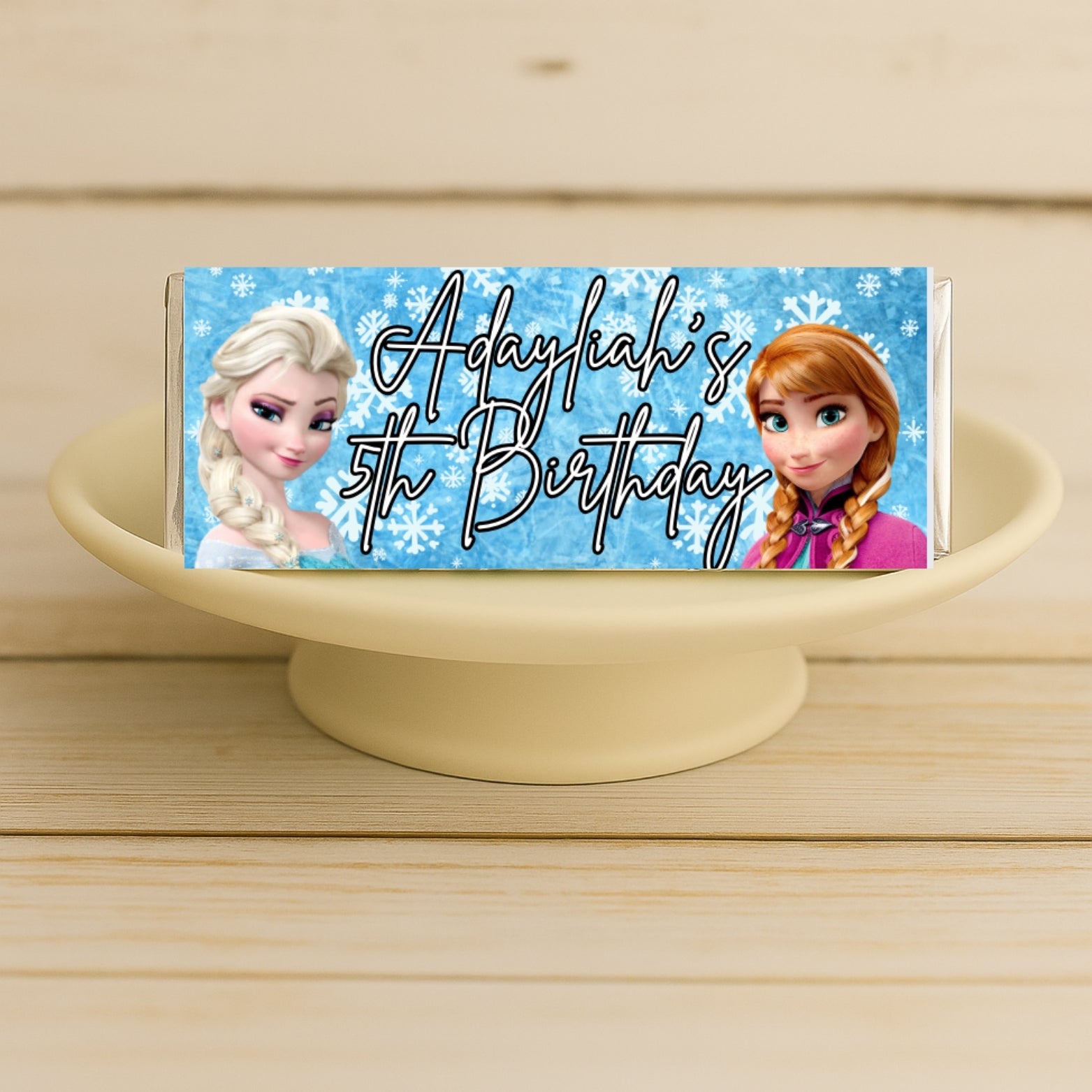 Bring the magic of Arendelle to your celebration with our "Frozen Chocolate Bars". Featuring the much-loved sisters Elsa and Anna against a sparkling snowflake backdrop, these chocolate bars are the perfect addition to any Frozen-themed party and a guaranteed hit with little fans.